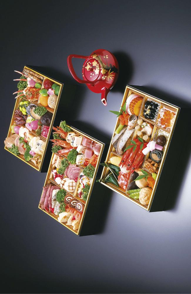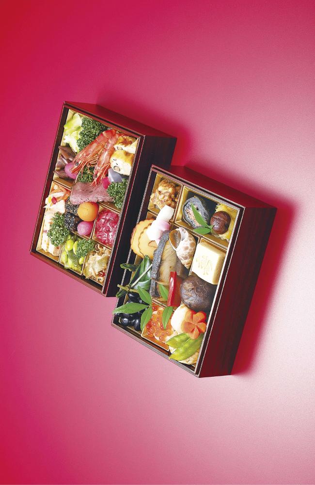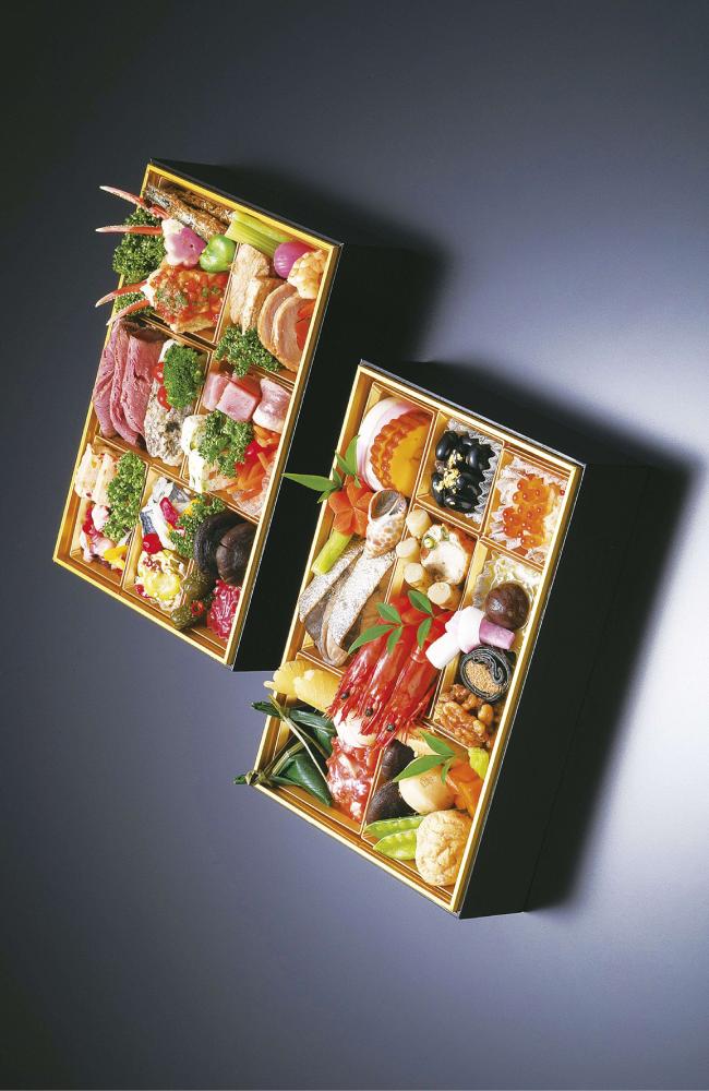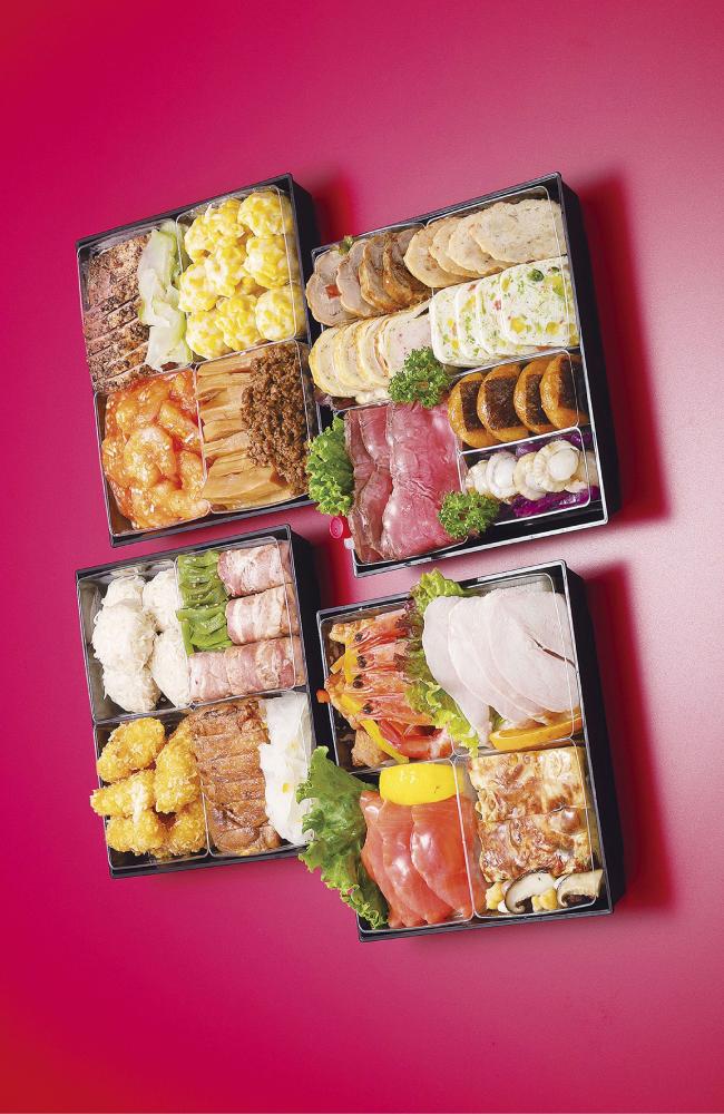 紅鮭昆布巻、鰤西京焼き、紅白結びかまぼこ、丹波ぶどう豆、きんとん、渋皮栗甘露煮、金時ミニ笹麩、赤こんにゃく牛肉射込み、黒豚こんにゃく、六角里芋煮、梅型人参ねじり梅、かしくるみ、伊達巻、味付バイ貝、がんも煮 、きぬさや煮、味付しいたけ、寿高野豆腐、いくら醤油漬、なます