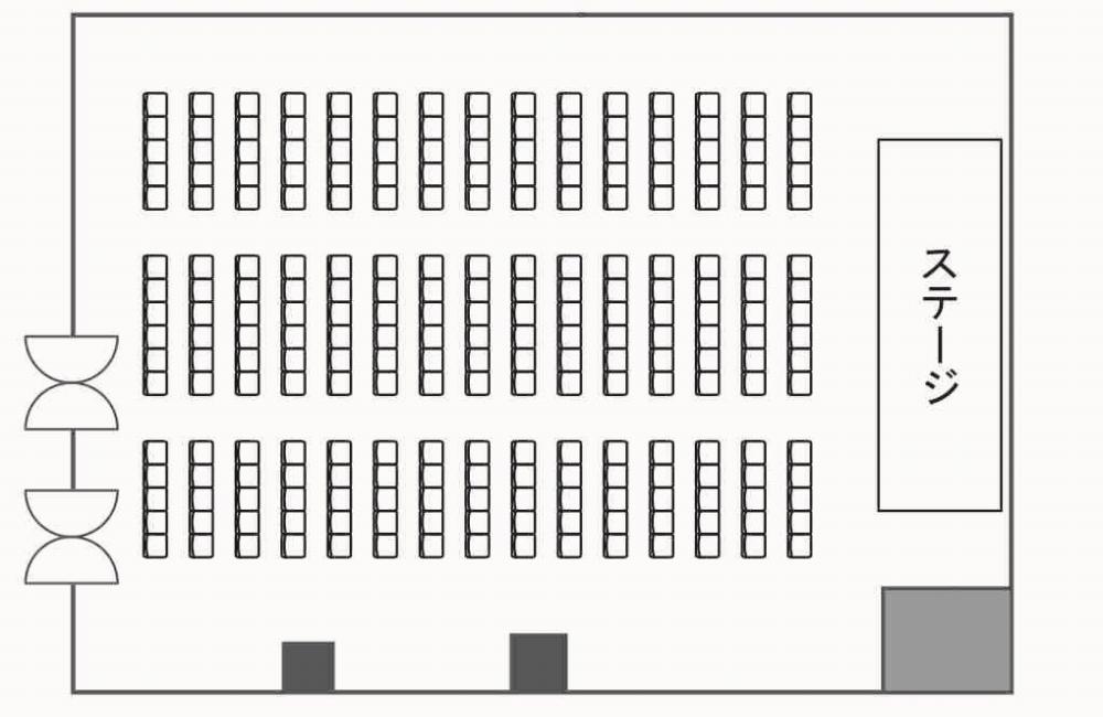 | 170~260人 | 舞台(仮設) ホール(19m×13.5m) 天井高(4.0m) 256m²(78坪) |